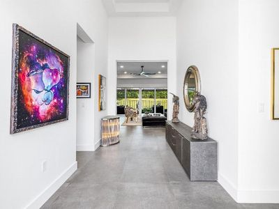 The magnificent great room is elevated by bold, timeless Versace wallpaper, adding sophistication and grandeur. The stunning dry bar, complete with illuminated shelving and a wine refrigerator, enhances the space, making it perfect for entertaining.