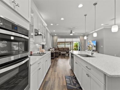 One or more photo(s) has been virtually staged. Discover this incredible opportunity located in Triple Creek that offers a lifestyle enriched by resort-style amenities! It's nestled next to the Nature Preserve, which boasts over 1,200 protected acres, 3.5 miles of hiking trails, and more than 18 miles of mountain bike trails. Built by Mattamy Homes in 2017, this Coquina II floor plan served as the model home and is situated on one of the most sought-after lots in a quiet cul-de-sac. Featuring a 3-way split layout, this home includes 4 bedrooms, an office, and 3 full bathrooms. There are two primary bedrooms, each featuring en-suite baths, making this home perfect for multi-generational living. The OPEN CONCEPT includes a spacious living room that easily accommodates oversized furniture, while the dining room features a CUSTOM mirror accent wall. The GOURMET kitchen has stainless steel appliances, QUARTZ countertops, a wall oven/microwave, and a walk-in pantry. The shaker-style cabinetry has lighted glass fronts, crown molding, light rails, and undermount lighting. The OVERSIZED backyard on this lot, that is just under a quarter acre, is adorned with tropical and vibrant landscaping! The gazebo is the focal point that provides just the right amount of shade for relaxation! Back inside, the first of two primary bedrooms has a tray ceiling, walk-in closet and ample room for a lounging area. The en-suite bathroom is equipped with dual sinks, QUARTZ countertops, a private water closet and a soaking garden tub. In addition, the generous shower has a seamless glass enclosure and floor-to-ceiling tiles accentuated by listello banding. The SECOND PRIMARY bedroom is generously sized and can easily fit king-size furniture. The en-suite bathroom features a walk-in shower with a glass enclosure, decorative listello banding, and a convenient shampoo niche. The two additional bedrooms are spacious, featuring walk-in closets and convenient access to the third full bathroom. This bathroom has been cleverly designed for dual functionality, with the sink area thoughtfully separated from the shower. The office has a tray ceiling with crown molding and windows that have architectural details. The laundry room is thoughtfully designed to enhance your experience with this chore! It features a dedicated folding area, a utility sink integrated into the vanity, and cabinets to neatly store all your supplies. The 3-car garage is tandem which provides a space to create a workshop and the opportunity to accommodate your recreational vehicles. Additional features and upgrades include high ceilings, 8 doors, crown molding, luxury vinyl plank flooring, 5 baseboards, UPGRADED tile and carpeting. Plantation shutters, motorized blinds on two sets of sliders, wood framed windows, surround sound speakers, recessed lighting, ceiling fans throughout, walk-in closets in every bedroom, and a neutral color pallet that will suit every decor. Triple Creek has community pools including a lap pool and splash pad, fitness, sports courts, playgrounds, dog park and plans to install pickleball courts! This ideal location is minutes to shopping, restaurants, I75 as well as less than 10 minutes to the VA Clinic and St. Joseph's Hospital South.