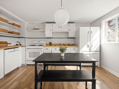 Entering at the garden level, an enclosed patio provides ample storage for bikes and other outdoor equipment before entering the home. Once inside, a cozy living room with a storage closet invites you to linger. Beyond, is the sunny and bright dining room with access to the backyard and an oversized window. Keep the two spaces separate, or combine for a large open concept living space to bring the stunning Southern light throughout the home. A sizable extension provides ample space for the eat in kitchen, currently featuring a mix of tile and butcher block counters, and a mix of open shelving and charming bead board cabinetry. A suite of white appliances including a french door, freezer bottom fridge and dishwasher complement the light and airy space that is washed in sun from two large picture windows. A full bath completes the floor.