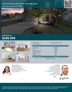 Investment property for sale in Kyle at 1437 Amy Dr, Kyle, TX, 78640 uses $95,140 cash to close to unlock $7,906/yr annual cash flow and $659/mo monthly cash flow. Total monthly income runs $2,700/mo, and a $1,405/mo payment keeps the spread at $659/mo. Purchase price stands at $286,999, and rental yield measures 11.29% with $2,700/mo rent. Return on cash invested shows 28.22% in year one, and 5% annual appreciation builds toward $79,293 over five years. Five-year ROI reaches 148.62% and total cumulative return in cash records $141,394. Financing may use Ziffy Mortgage’s DSCR loan, which bases approval on $2,700/mo property income covering a $1,405/mo payment rather than investor’s personal income.