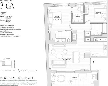The residences at 181 MacDougal are complete with essential modern luxuries, such as oversized windows that are pre-wired for motorized shades, Wi-Fi enabled high efficiency multi-zone VRF heating and cooling systems, 9' ceilings with J-boxes at all living/dining areas and bedrooms, fully equipped kitchens with built-in wine storage, full size washers and vented dryers, wide-plank oak floors throughout, and more.