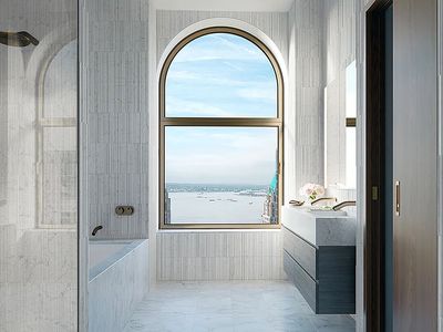 The primary bedroom suite features a large double-window and an airy windowed dressing room designed to even accommodate a desk or vanity. The luxurious primary bath is clad from top to bottom in Majestic White marble tile for a fresh and serene atmosphere, along with a double vanity and glass-enclosed shower with hand shower. The spacious secondary bedroom enjoys its own large double window as well, and the secondary bath is conveniently tucked away from the living space to function as a discreet powder room for guests.