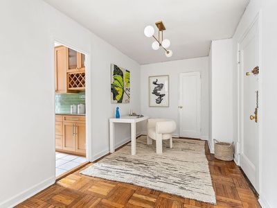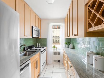 Step into the oversized foyer which doubles as a work from home space bordered by a multi shelved utility closet. Across from the front door, the windowed galley kitchen is lined with gleaming cabinets offset by green tile backsplash. There is plentiful storage and granite; it's an easy kitchen to cook in and keep clean. The adjacent airy living room is able to accommodate a variety of sitting area arrangements with additional versatile space for your dining area or library. The bathroom has a new vanity and a south facing window. The hallway which has a closet then leads to the generously sized bedroom, where there is yet another clothing closet and space to set up a home office. Four closets in total.