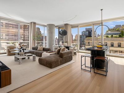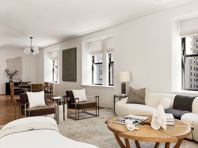 The kitchen features a sophisticated mix of white lacquer and stained oak cabinetry, complemented by Calacatta Gold countertops and backsplash. An integrated suite of top-of-the-line appliances by Gaggenau, Miele, and Sub-Zero completes the space. Ten-foot ceilings amplify the sense of grandeur that defines the Upper West Side. Additional features include a dedicated laundry closet with a Bosch washer/dryer, herringbone wood floors with walnut inlay, and individually climate-controlled thermostats in every room.