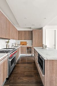 The expansive great room seamlessly connects the living, dining, and kitchen areas, ideal for both relaxed gatherings and entertaining on a larger scale. The kitchen blends craftsmanship with functionality, featuring custom Poggenpohl cabinetry topped with quartz counters, a Sub-Zero refrigerator, and Bosch appliances . A sizable center island anchors the room, offering generous counter space for culinary adventures and casual seating that makes cooking and conversation effortlessly intertwined.