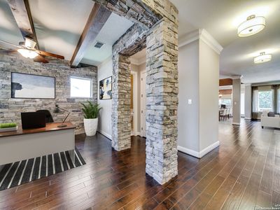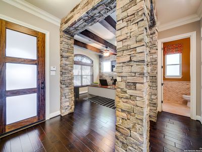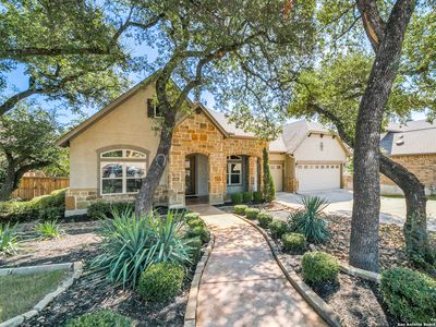 Step into a world where luxury meets comfort. This former David Weekley model home nestled in the prestigious gated community of Front Gate in Fair Oaks Ranch. Designed with meticulous attention to detail, this Texas Hill Country-styled home offers a blend of elegance and functionality for those with a discerning taste. The manicured landscaping and traditional Texas Hill Country architecture create instant curb appeal. The 8' front door, rich 5" Birch plank floors, 10' ceilings, oil-rubbed bronze hardware, high baseboards, and crown molding, sets the tone for the quality and designer attention to quality found throughout the home. Adjacent to the entry, the study is ideal for workspace for the busy executive featuring stone columns and accent wall, ceiling with stained wood beams, and wood cased windows providing abundant natural light. The open floorplan connects the kitchen, living room and dining into one great room, perfect for intimate gatherings or entertainment. The heart of this home is its kitchen, where elegancy and functionality meet. The glass front double-stacked cabinet, under-cabinet lighting, and tile backsplash make this kitchen a showcase. The large island, granite countertops, gas cooking, single basin sink, lazy Susan, and pull-out trash bin add convenience. The adjacent living room features a floor-to-ceiling cast stone gas fireplace. The sophisticated dining room brings natural elements indoors with its stone accent wall and vaulted wood slat ceiling. A built-in workstation with an L-shaped desk next to the back door adds versatility to this open space. The primary bedroom is a tranquil retreat with a tray ceiling and built-in speakers. The en-suite bathroom features a double wrap-around vanity, built-in dressing mirror with a bench seat, spacious walk-in closet, accessible frameless glass shower with body jets, and a garden tub. All secondary bedrooms boast walk-in closets. The front bedroom has an en-suite bathroom. An upstairs bonus room offers a flexible space ready for hobbies or movie nights and is prewired for a 7-speaker audio system and convenient half. Step outside to a private oasis. The outdoor kitchen enables alfresco dining, complete with a sink, refrigerator, connected gas grill, and granite countertops. The covered patio, with its beadboard ceiling and fan, provides a comfortable space to unwind, while the stone fireplace and connected speakers set the perfect ambiance for cool Texas evenings. Modern technology abounds, including a Trane 16 SEER dual-staged HVAC system, 2-water heaters, a whole-house water softener, and a reverse osmosis water filtration system. The security system with door and window sensors, a keypad, and an internal siren for peace of mind. Structured wiring, and interconnected speakers in the living room, primary bedroom, and back patio ensure that this home is as connected as you are. The three-car garage offers ample space for vehicles and storage. Extensive natural light is provided by windows in the garage doors and sidewall. Plantation shutters elevate this otherwise utilitarian space. Extensive home storage in walk-in closets, under deck space, shed, large floored walk-in attic, and back drop-zone keeps the garage free for cars or workshop/gym space. Located just a quarter mile from I-10, this home offers an easy commute to San Antonio. The nearby Rim and La Cantera shopping centers provide ample dining, entertainment, and shopping options. Fair Oaks Ranch is a community that embraces a lifestyle of leisure and luxury, with the Fair Oaks Ranch Country Club offering golf, tennis, and social events. The golf cart-friendly streets invite exploration, while the nearby police department ensures a safe and secure environment. Schedule a private tour today and experience the unparalleled luxury and convenience that this exceptional property has to offer.