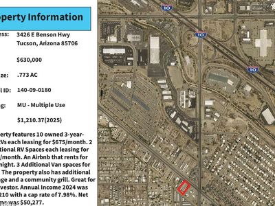 Rental property for sale in Tucson at 3426 E Benson Hwy, Tucson, AZ, 85706 generates $1,082/mo in rent, after a $3,084/mo payment. Total monthly income is $1,082/mo. Return on cash invested sits at 4.76% in year one, and rental yield is 2.06% on a $630,000 entry. Equity gained on principal adds $4,065/yr, while 5% annual appreciation builds toward $174,057 over five years. Five-year ROI reaches 21.22% and total cumulative return in cash sums $43,990. For financing, investors can use Ziffy Mortgage’s DSCR loan, which considers $1,082/mo property income rather than buyer’s personal income.