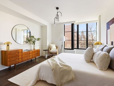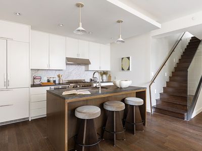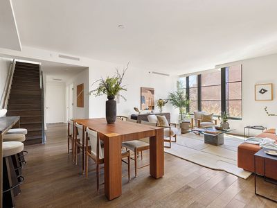 Step inside and be greeted by meticulous design framed in oversized casement windows, offering abundant natural light. The open-concept living and dining areas create a serene ambiance perfect for hosting guests. The modern chef's kitchen showcases top-of-the-line finishes, with Pietra Cardosa stone countertops, an Italian marble backsplash, and high-end integrated appliances from Liebherr, Miele, and Bertazzoni, epitomizing style and functionality.