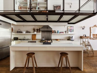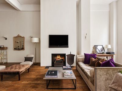 Inside this sprawling 3,200-square-foot residence, ceilings soar up to 20 feet high above hardwood floors, oversized windows on three exposures, and expansive art walls perfect for your prized collection. A gracious gallery entry flanked by an oversized walk-in closet ushers you into the open-plan great room stretching over 40 feet long to southern windows framing golden sunlight and treetop views. Enjoy a generous footprint for relaxing and entertaining surrounded by a towering column, built-ins, and a warm wood-burning fireplace. The open gourmet kitchen impresses with rows of white cabinetry, pantry space, a massive center island and Viking stainless steel appliances, including a vented range, bottom-freezer refrigerator, dishwasher and wine refrigerator.