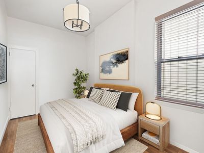 The windowed, eat-in kitchen is thoughtfully designed with soft sage-green granite countertops, custom wood and frosted glass cabinetry, stainless steel appliances, and a spacious breakfast bar that houses a wine fridge, invites conversation, connection, and everyday gathering. A windowed bathroom with a glass-paneled, rain shower adds a sense of ease and light. The bedroom is both spacious and serene, with abundant natural light and a large walk-in closet. Additional deep closets in the foyer offer rare storage that enhances the apartments livability without compromising its charm.