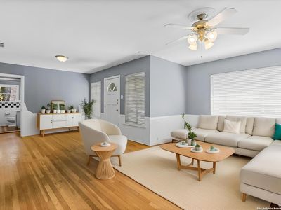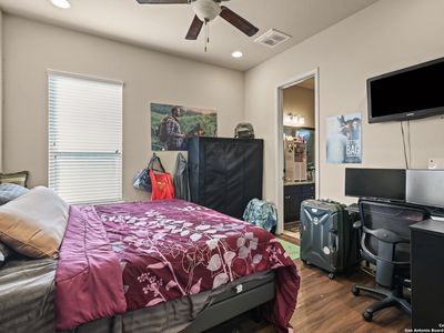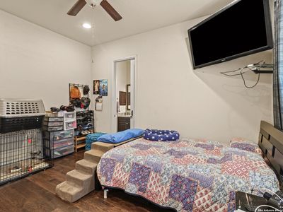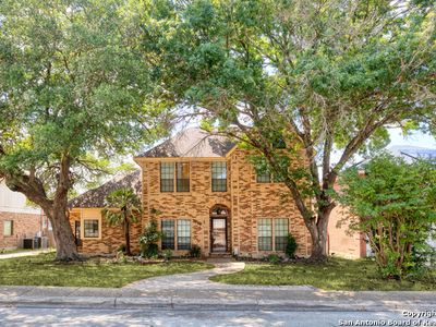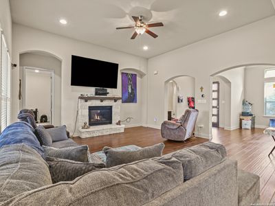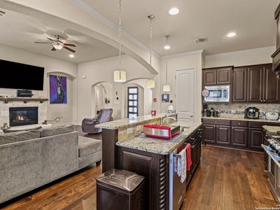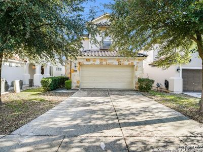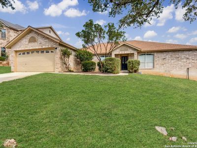 Stunning home located on a corner lot in the prestigious Amorosa section of Cibolo Canyons! This exquisite residence combines a prime location with an impressive array of eco-friendly features and modern luxuries that will captivate you from the moment you step inside. Designed for the environmentally conscious homeowner, this energy-efficient haven boasts solar panels clearly visible on the roof that dramatically reduce utility costs while minimizing your carbon footprint. The tankless water heater provides endless hot water on demand, while the whole house water softener ensures every drop is perfectly conditioned throughout your home. Upon entering through the striking modern front door with decorative glass panels, you'll immediately notice the meticulous attention to detail that sets this home apart. Rich hardwood floors flow seamlessly throughout the open-concept living spaces, creating warmth and elegance. Featuring two secondary bedrooms that share a convenient Jack and Jill bathroom plus a spacious primary suite, there's plenty of room for relaxation and entertaining. Each bedroom is designed to offer a peaceful and comfortable retreat, ensuring an exceptional experience for both you and your guests. One of the home's most remarkable features is its proximity to one of the area's top-rated golf courses, with stunning views of the pristine fairways visible from your beautifully landscaped backyard. The expansive corner lot is perfectly manicured with lush green lawn and mature trees, all enclosed by elegant black decorative fencing for privacy and security. The heart of the home is the gourmet kitchen, designed with culinary enthusiasts in mind. The massive granite island serves as both a workspace and gathering spot, while rich dark cabinetry extends to the ceiling for maximum storage. Stainless steel appliances and an oversized farmhouse sink complete this chef's dream. Exquisite pendant lighting and modern fixtures throughout create perfect ambiance for both cooking and entertaining. The open-concept family room flows seamlessly from the kitchen, featuring soaring ceilings and a stunning stone fireplace that serves as the room's centerpiece. Large windows flood the space with natural light while offering beautiful views of the golf course beyond. The owner's retreat is a spa-like sanctuary, complete with a luxurious en-suite bathroom featuring dual vanities with granite countertops, a soaking tub, and a spacious walk-in shower with elegant tile work. The expansive walk-in closet provides ample storage for even the most extensive wardrobe. Additional highlights include a versatile office/study space, crown molding throughout, and a three-car garage with built-in storage solutions. The covered patio extends your living space outdoors, perfect for enjoying the serene golf course views and entertaining guests year-round. This isn't just a home-it's a smart investment in sustainable luxury living with unparalleled golf course lifestyle. Welcome home! Also Includes Washer, Dryer and Refrigerator.