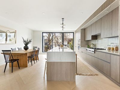 Awaiting home chefs of every level is a stunning eat-in kitchen equipped with a reclaimed wood island, custom millwork, a double-door pantry, and sleek Lemurian Baobab granite countertops and backsplash imbued with iridescent Labradorite. The high-end Miele appliance suite includes a stainless steel gas-burning range, an integrated refrigerator and dishwasher, and dual under-counter beverage drawers. Beyond the kitchen is a discreet powder room with a custom reclaimed wood countertop and a one-of-a-kind vessel sink.