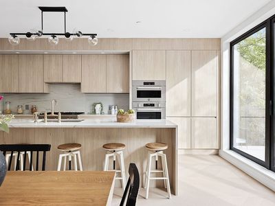 Flexible and inviting, the home is configured with four large bedrooms, with one being used as a dedicated home office or guest room. The king-size primary suite is tranquil and private, adorned with two massive walk-in closets, a separate dressing area, and a spa en-suite with chic tilework, a double vanity, step-in shower, and a freestanding clawfoot soaking tub. The second and third bedrooms have walk-ins and share access to a four-piece full bathroom with a walk-in shower, while the fourth bedroom/office includes a concealed storage space, a reclaimed wood dressing room, a custom Murphy bed, and a full en-suite bathroom with Cassiopea quartz countertops.