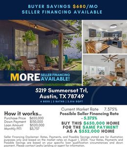Investment property for sale in Austin at 5219 Summerset Trl, Austin, TX, 78749 listed at $650,000 pairs $4,997/mo rent with a $3,181/mo payment to leave $375/mo cash flow. Total monthly income runs $4,997/mo, and annual cash flow reaches $4,502/yr on $213,850 cash to close. Return on cash invested measures 22.17% in year one, and rental yield registers 9.23% at a $650,000 basis. Equity gained on principal adds $4,194/yr, and annual property appreciation at 5% supports $179,583 by year five. Five-year ROI tracks 116.14% and total cumulative return in cash totals $248,366. Financing can be arranged with Ziffy Mortgage’s DSCR loan, which qualifies using $4,997/mo property income relative to a $3,181/mo payment rather than your personal income (W2, Tax Returns, Paystubs, or 1099).