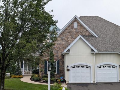 Imagine turning onto a quiet, private lane and arriving at your destination: a stunning end-unit carriage home, peacefully situated at the top of the street where the only traffic is your own. This is more than just a house; its the key to a lifestyle of luxury, convenience, and flexibility. For those seeking to downsize from a larger property with acreage, it presents the perfect solutiona way to shed the burden of exterior maintenance without sacrificing the expansive interior square footage and high-end finishes you cherish. The homeowner's association gracefully handles the roof and all exterior care, offering a true lock-and-leave freedom. Upon entering the soaring octagonal foyer, the home immediately reveals its thoughtful design. The main level unfolds with gleaming hardwood floors, offering a complete, self-contained living space ideal for those planning for the future or desiring the ease of one-floor living without the constraints of a 55+ community. Here youll find a serene primary suite, featuring a beautifully updated spa-like bathroom. Second full bedroom with a directly accessible bath is perfect for guests or a home office. The open great room, gourmet kitchen, and adjacent deck create an inviting hub for daily life and effortless entertaining. This home also grows with a family, providing abundant space and a place within the highly acclaimed Central Bucks School District. The fully finished, walkout lower level is a world of its owna sun-filled space with full windows, a dramatic double-sided stone fireplace, and its own private entrance from the garage. This level offers a third bedroom, a full and half bath, a wet bar, and custom built-ins, making it an ideal retreat for teenagers, visiting college students, or long-term guests. Its a home that adapts to every chapter of life, offering both togetherness and personal space. While it feels like a secluded retreat, its location is unmatched in its convenience, being walkable to the year-round destination of Peddlers Village and just a short drive from major highways, providing easy access to Philadelphia, New Jersey, and airports for travel or commuting. This property truly offers a unique combination of peaceful luxury and connected living, ready to welcome its next story.