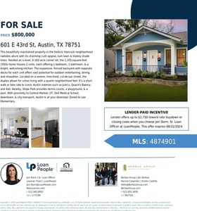 Investment property for sale in Austin at 601 E 43rd St #A & B, Austin, TX, 78751 earns from $2,760/mo rent with a $3,916/mo payment. Total monthly income totals $2,760/mo. ROI tracks 6.7% on current figures, and rental yield reads 4.14% at a $800,000 purchase. Equity gained on principal adds $5,162/yr, and 5% annual appreciation supports $221,025 over five years. Five-year ROI reaches 33.22% and total cumulative return in cash sums $87,440. Financing can be set up with Ziffy Mortgage’s DSCR loan, which is driven by $2,760/mo property income instead of your personal income.