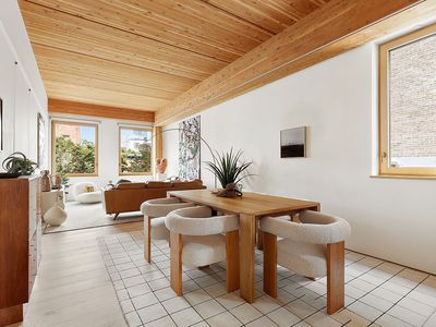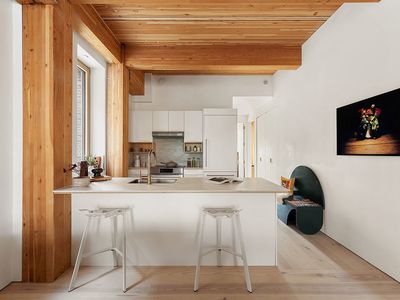 Upon entering, you are greeted by an expansive great room designed for both sophisticated entertaining and tranquil daily life, with soaring ceilings and wide-plank white oak floors creating an atmosphere of airy refinement. Every window is triple-glazed and Passive House-quality, blocking outside noise. The open-plan chef's kitchen is a model of functional elegance, featuring custom, hand-painted cabinetry, integrated Bosch and Liebherr appliances, and a stunning honed marble countertop and backsplash that seamlessly blend form and function.