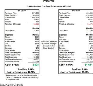 Investment property for sale in Anchorage at 7230 Basel St, Anchorage, AK, 99507 earns from $2,550/mo rent with a $4,283/mo payment. Total monthly income totals $2,550/mo. ROI tracks 8.46% on current figures, and rental yield reads 3.5% at a $875,000 purchase. Equity gained on principal adds $5,646/yr, and 5% annual appreciation supports $241,746 over five years. Five-year ROI reaches 41.28% and total cumulative return in cash sums $118,823. Financing can be set up with Ziffy Mortgage’s DSCR loan, which is driven by $2,550/mo property income instead of your personal income.
